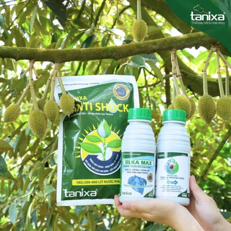 “Chỉ sau 1 ngày ra thấy lá bóng lưỡng. Mà bông trái không bị gì nghen. Mê thằng Anti shock này của Tanixa lắm. Đúng kiểu người thiếu máu mặt tái mét, cây thiếu nhựa cũng xiu cò.” – chị Tấm trồng sầu riêng tại Long Khánh, Đồng Nai.